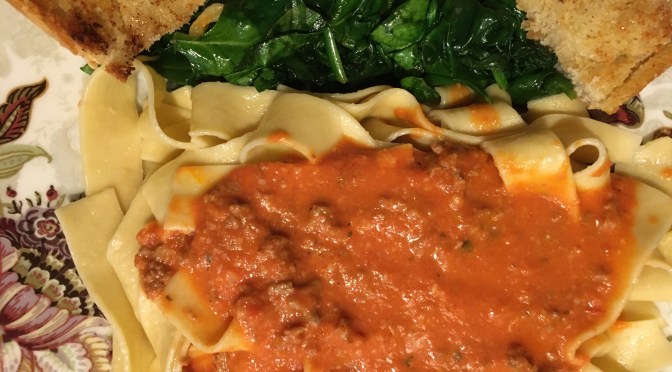 By the time the sauce was warm and at a simmer the pasta water was boiling. I did the next logical step, and added the pasta to the WATER and gave it a stir. Then I set the timer. Please don’t overcook your pasta. It gets mushy. Usually the manufacture recommends a three-minute range. I boil it to where it’s right in the middle of that range unless I’m making Ziti but that’s a different recipe.