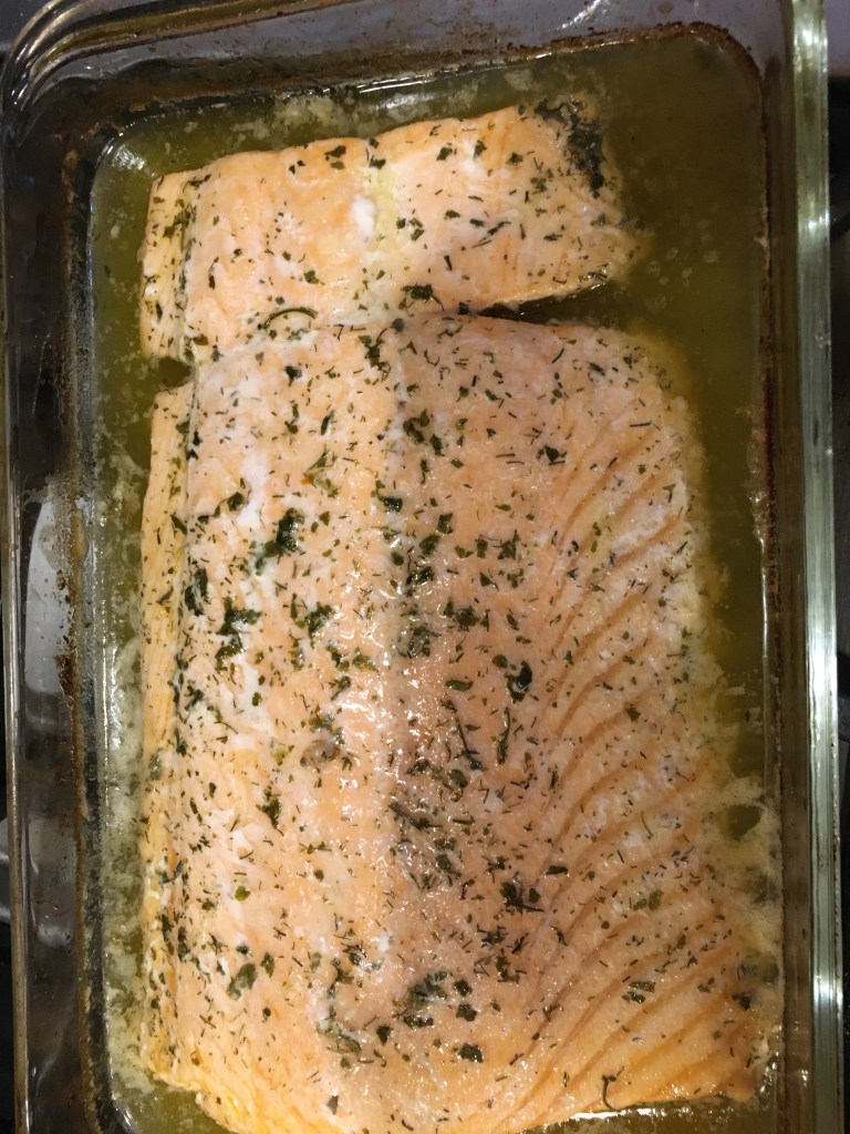 Some days, you just need to eat fish. This was how I felt Sunday. Besides, I really need to get rid of this huge piece of fish in my freezer that I have been moving around for six months. I was going to fire up the grill but it looked like rain. I have cooked many fish in the great outdoors. It keeps the house from smelling too “fishy” which Jen appreciates. I guess we will have to wait for that until next time, and nice weather. For now, we will turn to the oven.