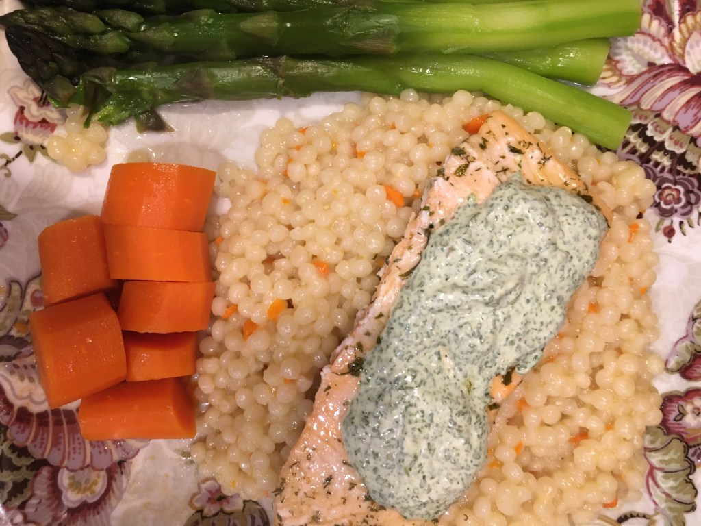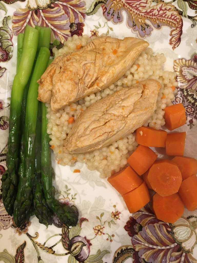 I added two cups of large pearl Couscous to the pot of chicken stock with the carrot bits and stir. Bring the couscous to a boil then cover and reduce heat to low. In five minutes, I added three tablespoons of butter and stirred again. Cover and cook five more minutes. Turn off heat and let stand. Mmm fluffy.