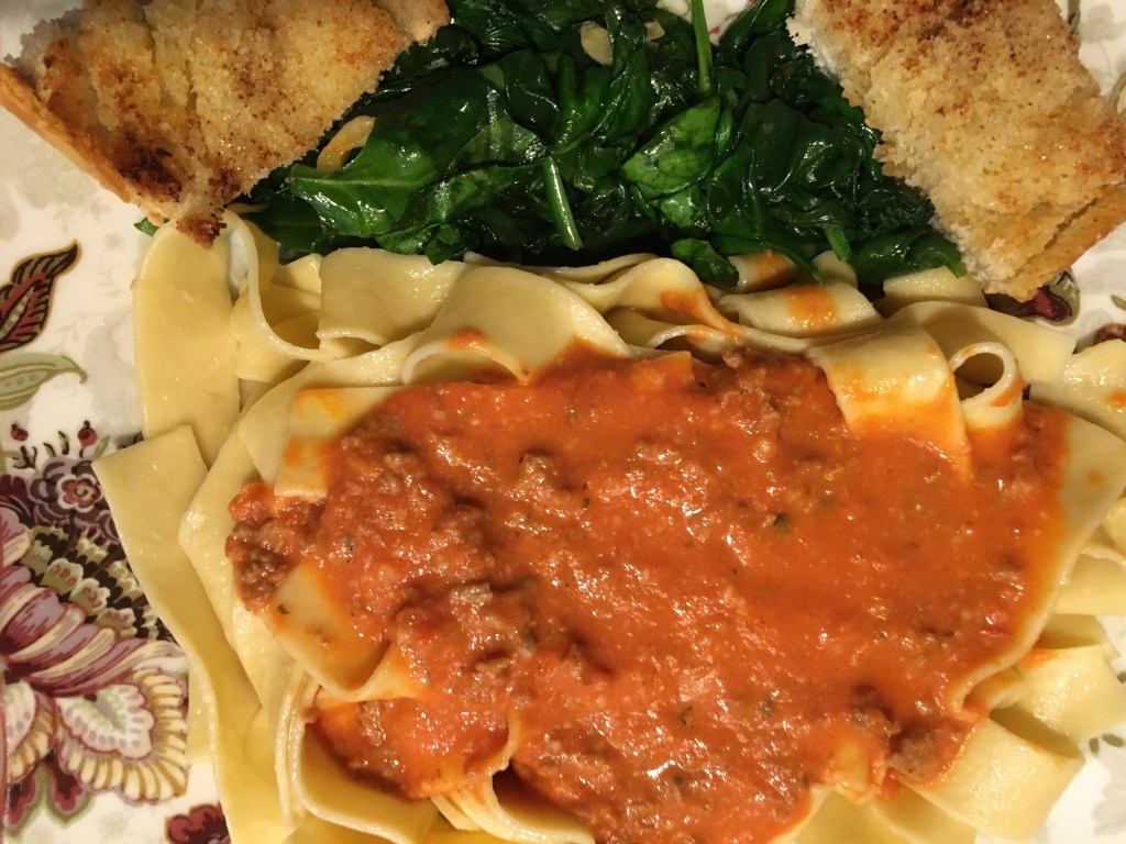 I put up the water to boil and defrosted my last quart of homemade meat sauce. Now traditionally I wound have used this sauce right on the pappardelle but as luck would have it I had heavy cream. I also like the pink sauce because my stomach has been cranky and mad at me so I too opted for the cream sauce just like it was suggested.