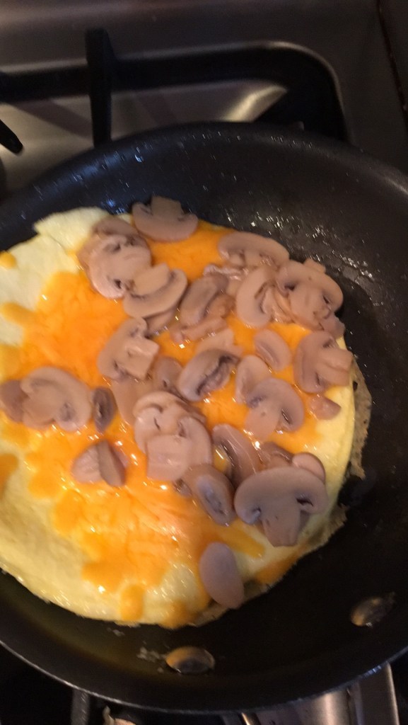 Scramble the eggs using a fork or whisk. Add milk instead of water; this makes the eggs a little softer and fluffier when cooked. Preheat pan on medium heat and add a pat of butter. Remember not to make the pan too hot because burnt butter tastes nasty. Pour in egg mixture and cover. When the egg is cooked through, add your vegetables and cheese to the left half of the egg (if you’re a righty). Cover to heat. Flip second half of egg over vegetables and cheese. Remove from pan and serve on a warm plate.