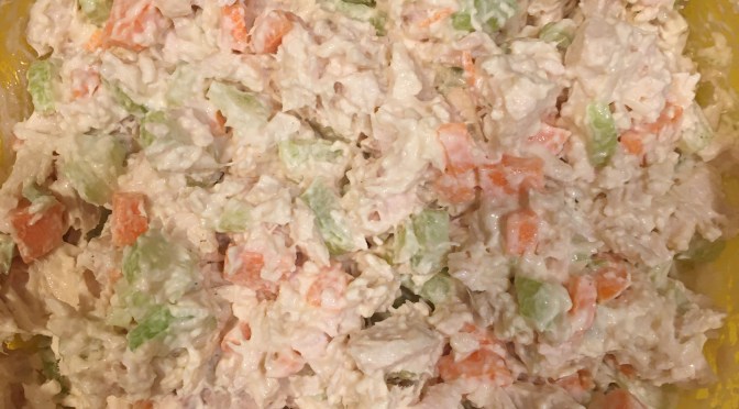 Tuesday and this morning I made Jennifer chicken salad for lunch. I had made the chicken on the grill after marinating it overnight in salad dressing. You can use any leftover white meat skinless boneless chicken breast. I have even cut the chicken breast right off a whole roasted chicken or one I have I’ve made chicken soup from. The breast meat from chicken in the soup gets diced up and put into the fridge, while all the dark meat goes into the soup.
