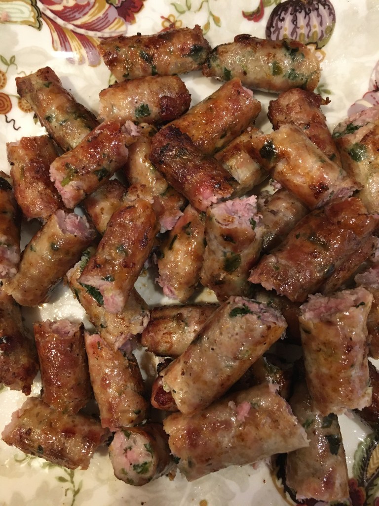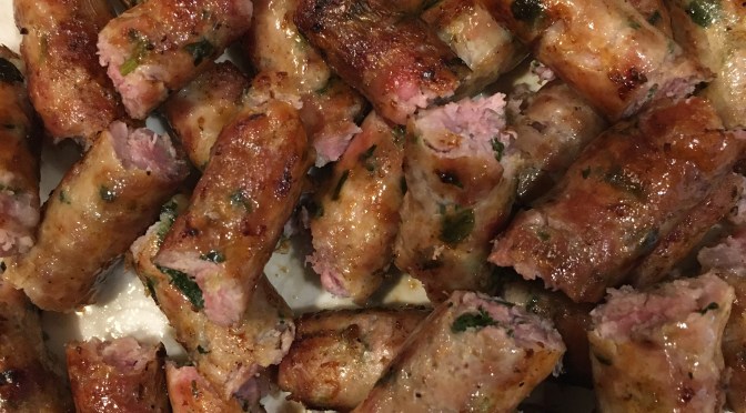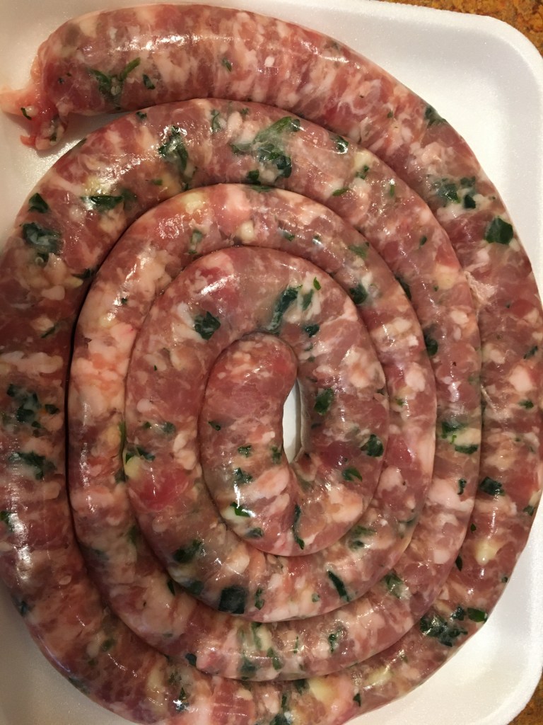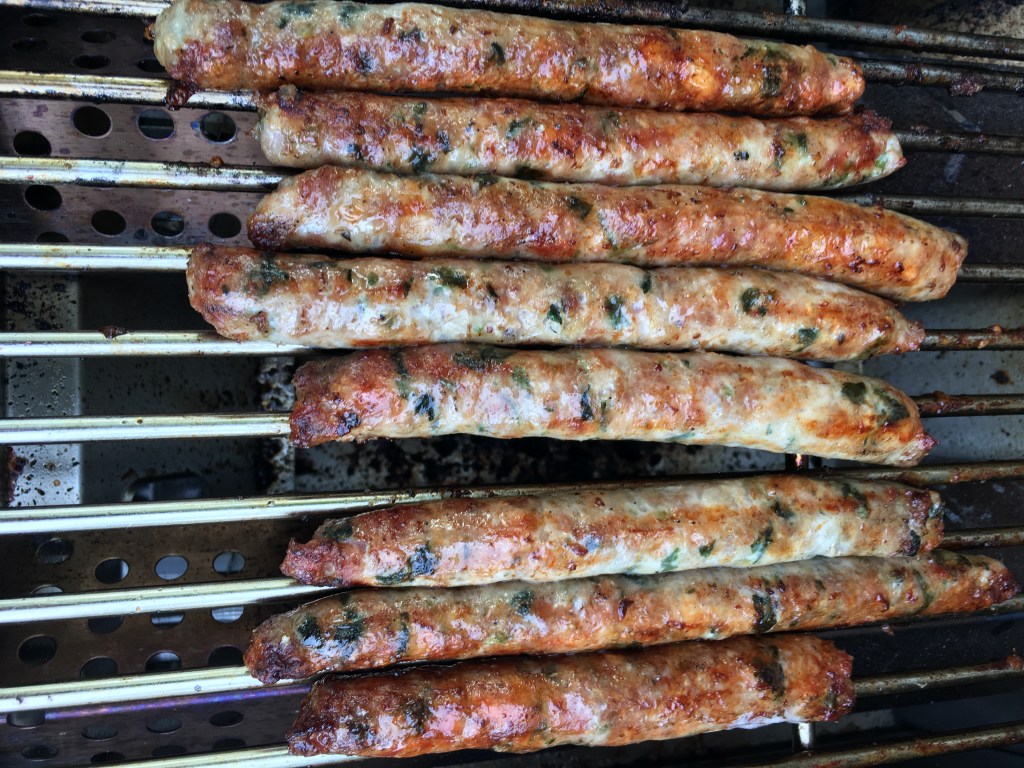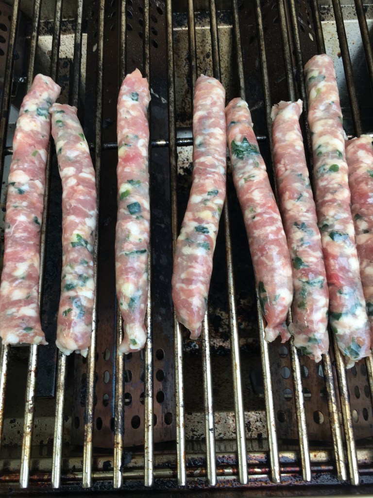 Preheat grill. Cut the sausage into 8 to 10 inch lengths. Using a paper towel and long tongs, apply a thin coat of olive oil to the grate just before cooking. Lay on the sausage in line with the grate. This prevents them from rolling. I do the same thing when making “HOT DAWGS”. Turn the usage every 3 minutes or so. Keep and eye on them as the flare-ups sometimes happen fast from the fat and you could wind up with sausage that is burned beyond recognition if you walk away. Turn, turn turn (like the song says) until finally, after god knows how long (my internal timer says two beers) they are a nice rich golden brown like the color of my dining room table on the homepage.