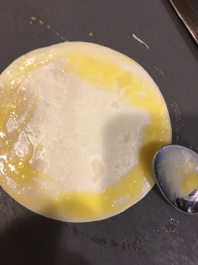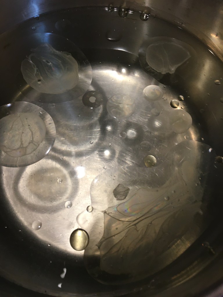 At home I poured all the liquid ingredients into a plastic Tupperware bowl. Then I added all the spices list above and brought that with me to work. I left out the dill because I was out of it. I will pick up more today at the market by my office. Once at work I began by peeling the cucumbers. Turns out, I had a crappy peeler in my knife bag and it took forever. I need to replace that. Then using a chefs knife and plastic cutting board I sliced the cucumber into pretty thin circles. I may bring in my mandolin next time to make the slicing easier. Then I peeled and sliced an onion into half moon shapes. I added both of these items to my brine like substance I made at home. I put on the lid and stuck it in the refrigerator to marinate over night.