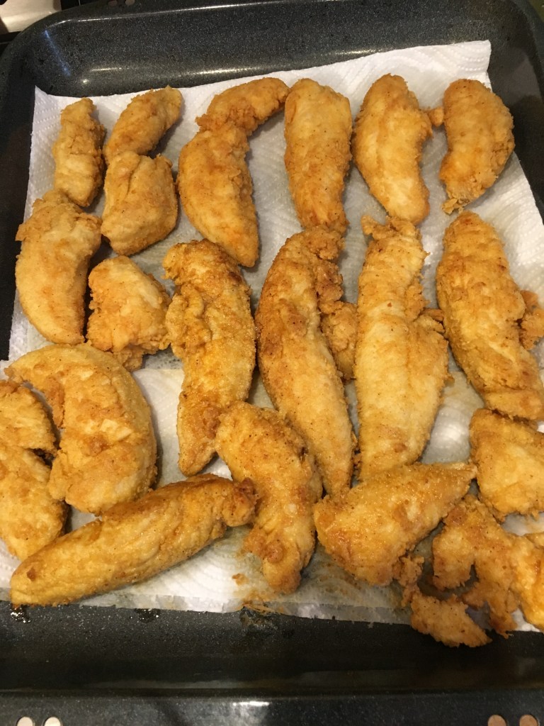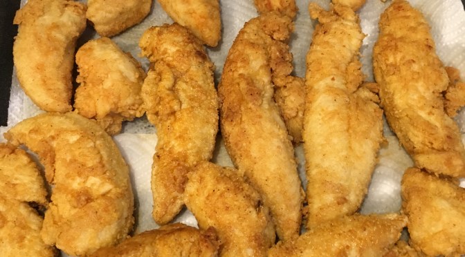 Preheat oven to 350 degrees. In a medium size bowl add water to eggs and beat with a fork eggs until evenly blended and pale yellow. Slowly add flour to eggs mixture. Eggs mixture should be the consistency of thin pancake batter, adjust flour or water as necessary. If you have not done so cut the chicken breasts into 1½ inch strips. Add chicken strips to egg mixture and coat evenly. Now coat chicken with bread crumbs. Let chicken stand while heating a ½ inch of vegetable oil on medium high heat to 350 Degrees (in other words HOT oil). Once the oil is hot CAREFULLY add the chicken using tongs. That oil is hot! Turn chicken over when a nice even deep brown and cook on the second side. Don’t over crowd pan with chicken or it will take too long to brown and you wind up with greasy chicken. Remove cooked chicken to a jelly roll pan or cookie sheet lined with paper towels. Don’t forget the paper towels or again you will wind up with soggy chicken. Place the first batch in the preheated oven. Turn the oven off. We are just trying to keep the chicken warm while making the next batch of wings.