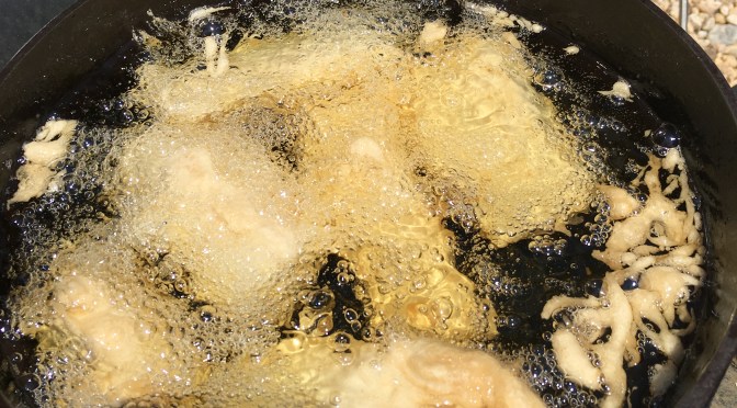 Heat half a pot of peanut oil to 375 degrees. Preferably using a cast iron pot or good electric deep fryer.