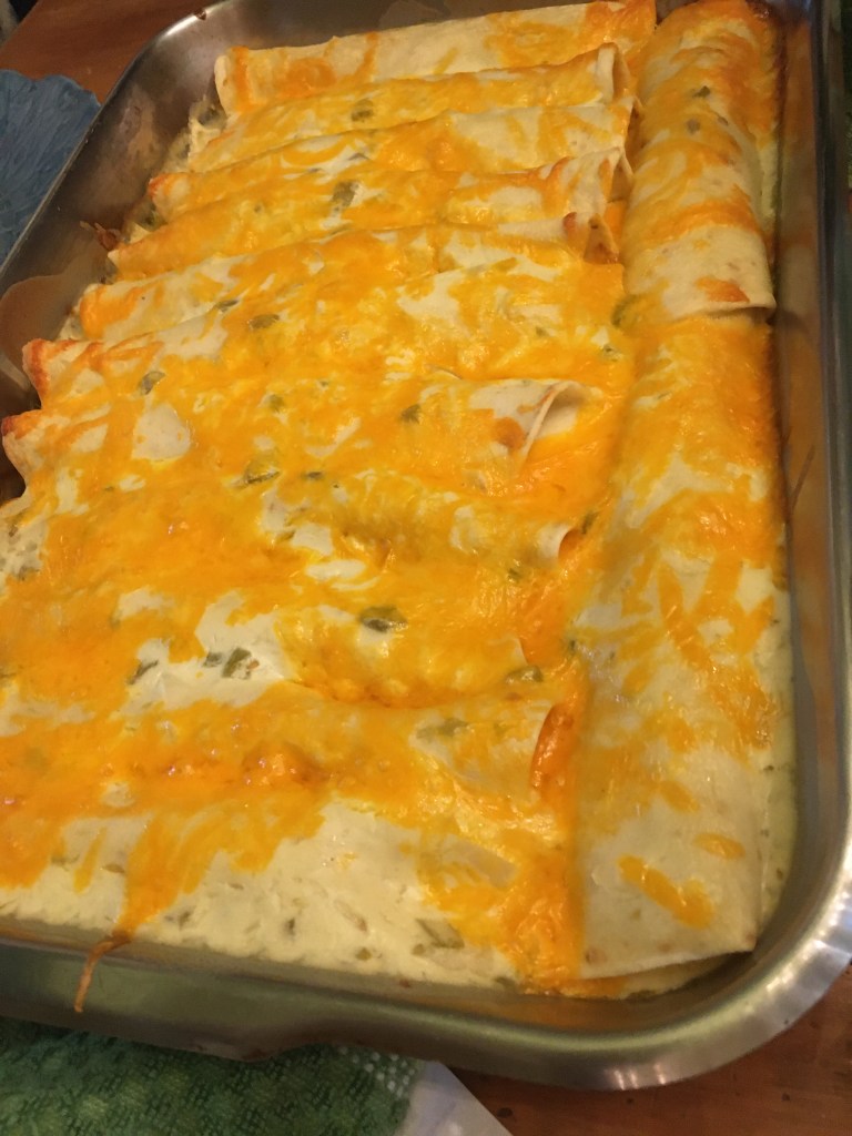 Monday, I ate at my sister in-law’s. She is an EXCELLENT cook. She made the dish below. They are chicken enchiladas, and they were amazing. The only things that I know are in them is cheese and chicken, duh, and sour cream. Otherwise, I have no clue.