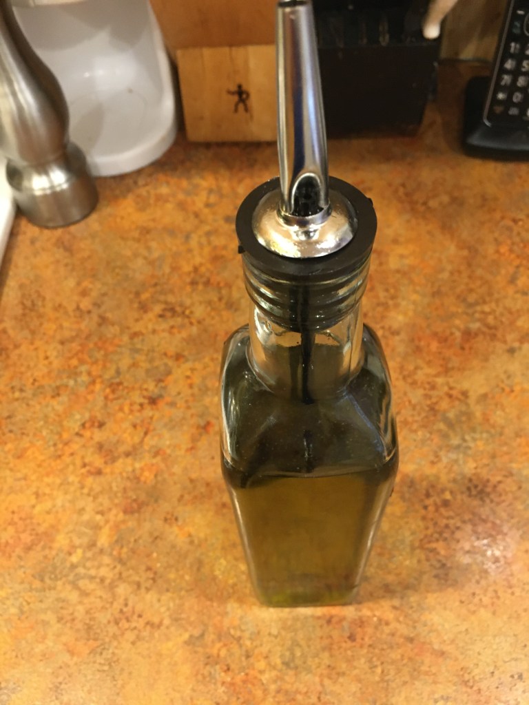 Below is my bottle of olive oil, not a liquor bottle. The pour spout makes pouring out the olive oil a little more controlled then straight from the bottle. Plus, I just think it looks cool sitting on my counter.