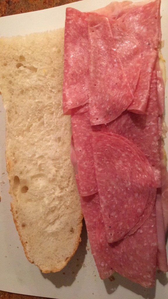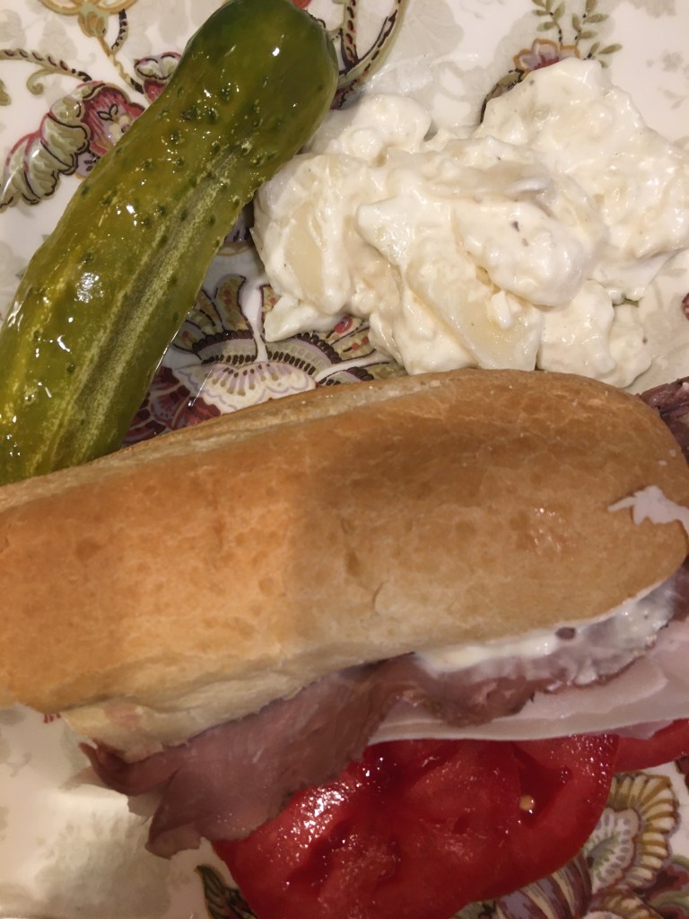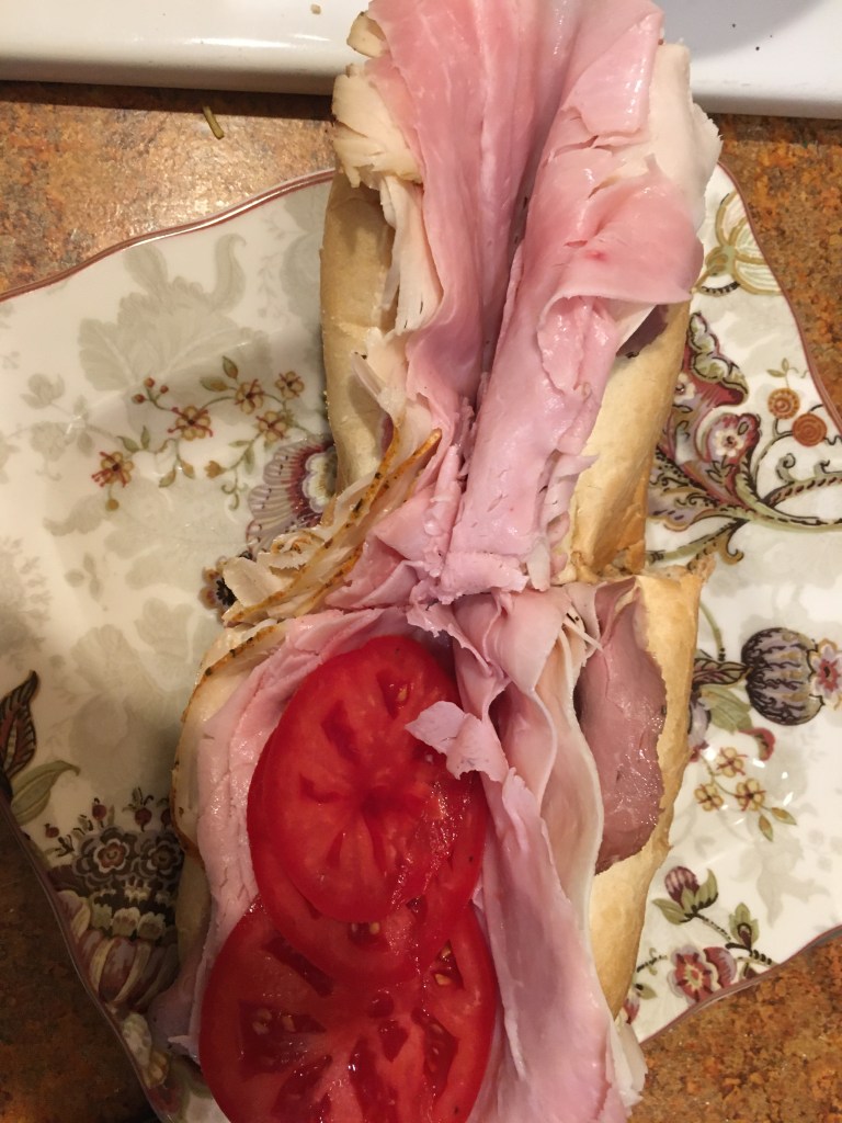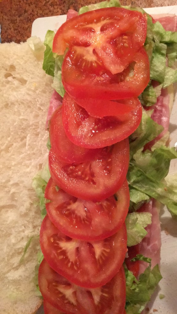 Tonight is sandwiches. You have to have them for dinner at least once in August during the heat of the summer. The one below is an American hero with roast beef, turkey, ham, lettuce, and tomato. My sister-in-law got me the tomato at a farm stand, and I have been savoring it.