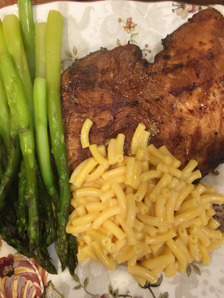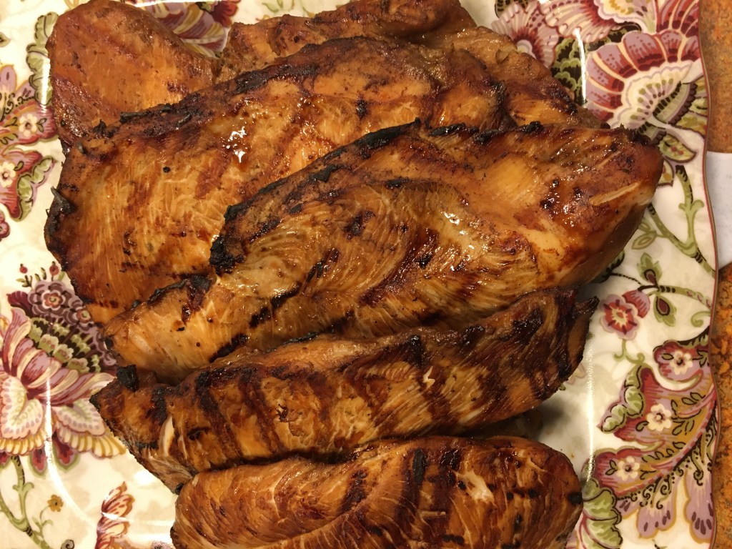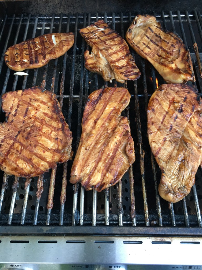 That done, it was time to put the chicken on the grill. I faced it Italian dressing side down. The dressing helps the chicken from sticking to the grates. Plus the dressing adds some flavor and maybe helps keep it moist.