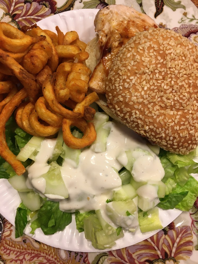 By the time the chicken was done so were the curly fries. I heated up some barbeque sauce in the microwave and put it on the tops of sesame seed buns. Then came the chicken next between the buns. A little salad dressing on the salad and BOOM! It was time to eat.