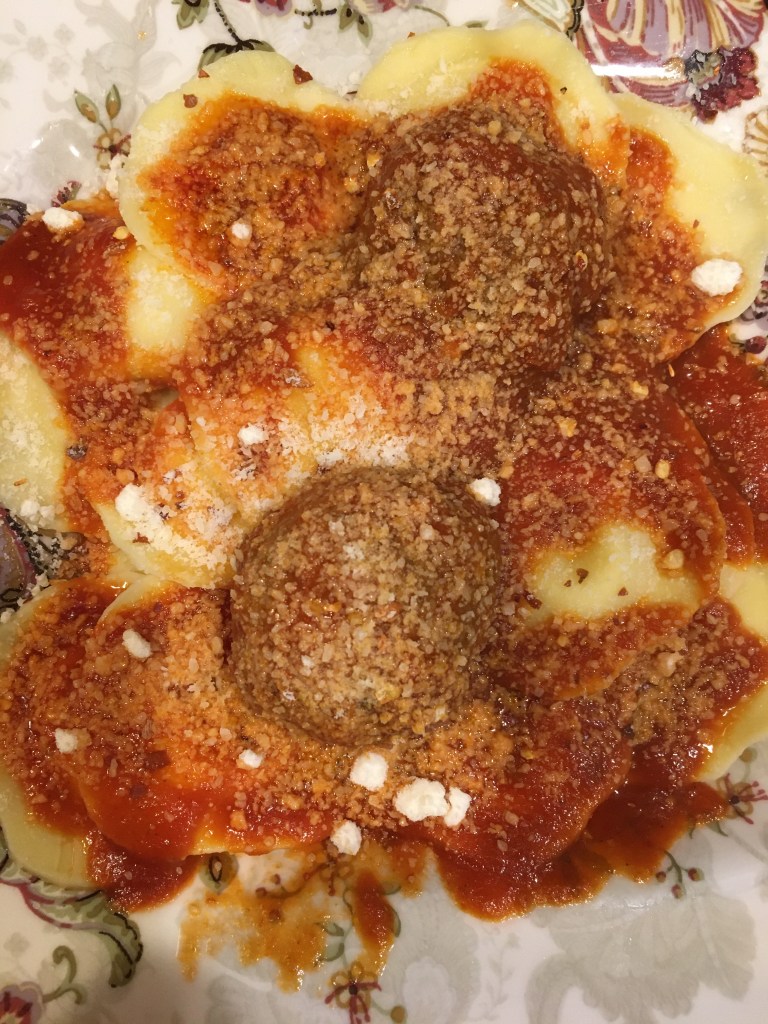 Last night I didn’t eat anything amazing. After a short early evening Scout meeting, I made plain old cheese ravioli and heated up my left over meatballs and sauce to go with it. We all (Jen, Sam and my mother -in-law) all watched Jeopardy and Samantha Brown’s vacation spots to love. Then we called it a night and went to bed.